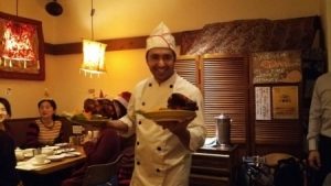 ゲストの前での厳粛なるホールチキンのカットショー!